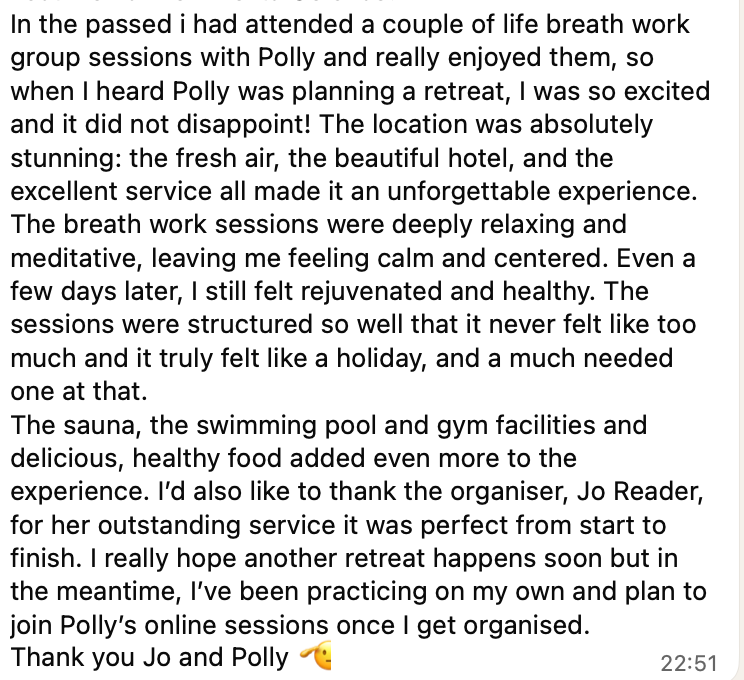 Alongside the sessions, you’ll learn how to breathe in a way that supports calm in real time — not just on the retreat, but in your everyday life. Whether you’re walking, working, exercising, or simply caught in a spiral of overthinking, you’ll leave with simple, body-led tools to return to your centre — anytime, anywhere.
